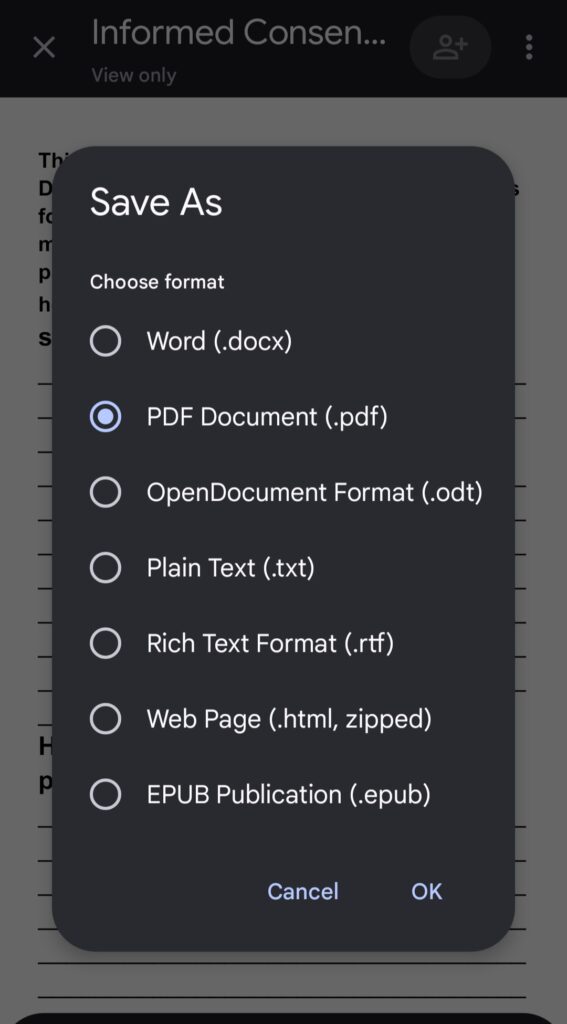 Open Google Doc link in email > 3 dots on top right> Share & export >save as or print> If save as- select PDF > Select ok